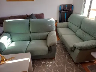 Conjunto de sofás de tres y dos plazas en muy buen estado. Son cómodos y elegantes. - Tapicería de tela. - Color verde. Poco uso y muy pocos detalles