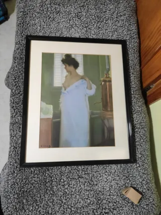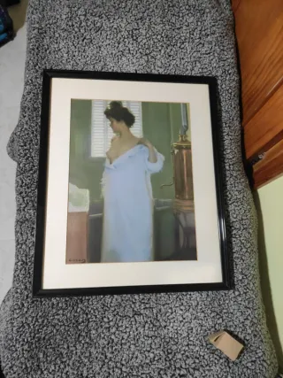 Precioso cuadro decorativo con marco de madera negra. La obra representa a una mujer en un interior. - Marco de madera. - Papel de alta calidad.