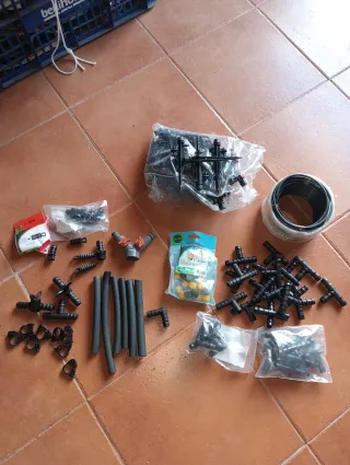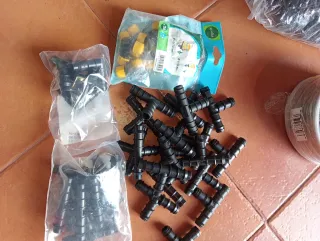 Lote de accesorios para sistemas de riego por goteo. - Conectores en T. - Codos. - Tapones. - Tubos de goma. - Válvulas.