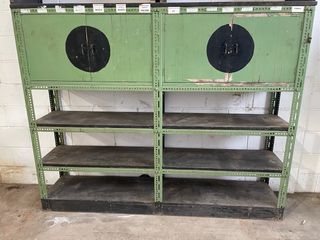Estantería/mueble de estilo industrial vintage, muy robusto. Estructura metálica con baldas amplias y armarios superiores con puertas. Ideal para taller, almacén, tienda o decoración industrial. Con pátina original y marcas de uso que le dan carácter. Solo venta en persona