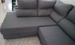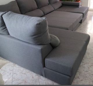Sofá cama de gran tamaño, perfecto para salones amplios o como solución extra para invitados. - Tapicería de tela. - Diseño modular. - Color gris neutro.