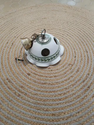 Bonita lámpara colgante de estilo vintage con un diseño único. - Cuerpo principal de cerámica blanca. - Detalle decorativo en verde. - Elementos metálicos en la parte superior. - Base con borde ondulado.
