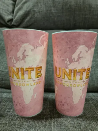 Set de dos vasos de una edición especial de Unite with Tomorrowland celebrada en Barcelona hace unos años. - Diseño temático Unite with Tomorrowland. - Estampado de mapa mundial en tonos rosas y crema. - Material plástico, en perfecto estado.
