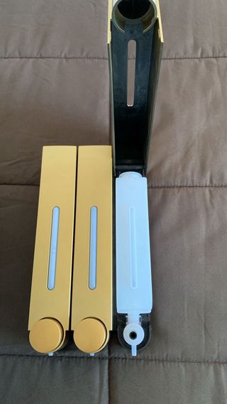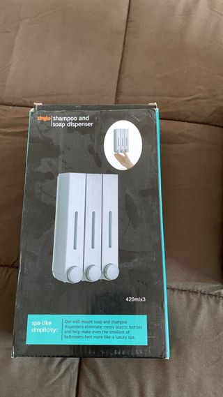 Dispensador de pared para jabón y champú, ideal para organizar tu baño. - Diseño de tres compartimentos. - Capacidad de 420 ml por compartimento. Son dos. Cada uno 7€