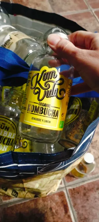 Una bolsa entera de botellas de varios tamaños y bptes de cristal. Ideales para kombucha casera, kéfir, caldos etc.
