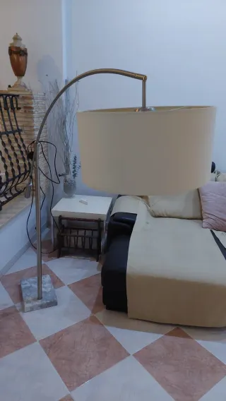 Elegante lámpara de pie para salón con un diseño moderno. - Base de mármol. - Estructura metálica. - Pantalla de tela.