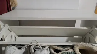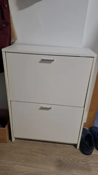 En Vilamarxant. Mueble zapatero con espacio para aproximadamente 8 o 10 pares de zapatos según su tamaño. Su diseño es moderno y funcional. - Dos compartimentos abatibles. - Tiradores metálicos. Se puede ver que está deteriorado un poco, se arregló con masilla y la parte de atrás no se ve al estar pegada a la pared por lo que la parte estética se mantiene como se aprecia en las fotos. Quien sea manitas puede ponerlo a punto los tornillos para que acople bien. Precio no negociable