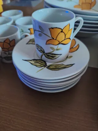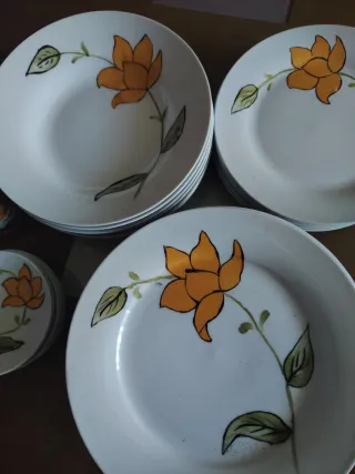Set de 24 piezas de vajilla con un bonito diseño de flores naranjas. - Incluye platos llanos,hondos,postre y juego café completo - Diseño pintado a mano. - Por 15€ más mantelería a juego con el mismo dibujo