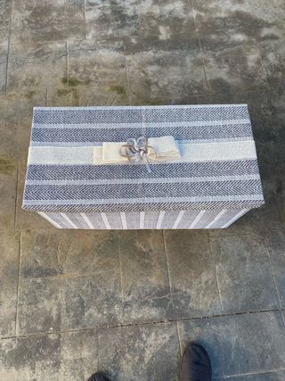 Baúl decorativo con un diseño de rayas verticales y horizontales. Nuevo como se puede ver en las fotos, nunca se ha usado. - Acabado en tejido. - Combinación de colores beige y gris. No hago envios.