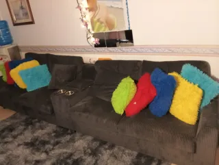 Sofá modular de 6 plazas, ideal para salones amplios. Su diseño moderno y confortable lo convierte en el centro de atención. - Tapicería de pana. - Incluye cojines decorativos de varios colores.