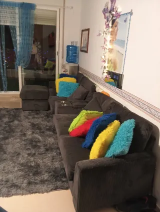 Sofá modular de 4 plazas en perfecto estado. Su diseño moderno y cómodo lo hace ideal para cualquier salón. - Tapicería de pana. - Incluye cojines decorativos de varios colores.