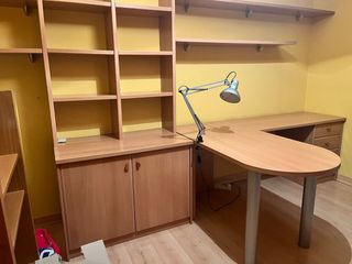 Conjunto de mobiliario para estudio o despacho, combinando funcionalidad y diseño. - Escritorio con superficie amplia y forma de L. - Estanterías integradas para almacenamiento. - Cajonera para organizar documentos y objetos.