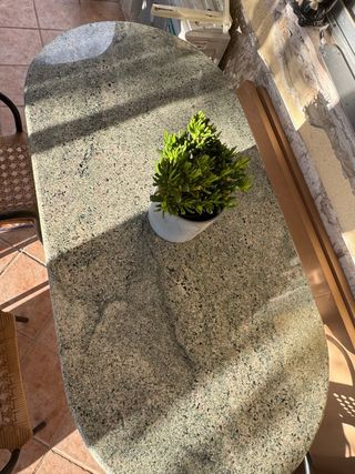 Elegante mesa con superficie de mármol y base de hierro. - Diseño ovalado. - Combinación de colores beige y gris en el mármol.