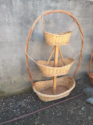 Elegante estantería de mimbre con estructura de madera, ideal para colocar plantas o decoraciones. - Tres cestas de diferentes tamaños. - Diseño curvo y orgánico. - Base de madera. más grande: ancho 70cm, largo 118cm otro: ancho 60cm, largo 92cm precio por unidad