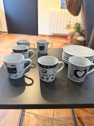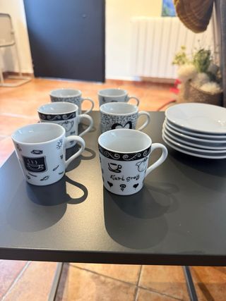 Conjunto de seis tazas y platitos para café, con un diseño elegante en blanco y negro. - Tazas con detalles gráficos. - Platitos a juego. - Fabricadas en porcelana.
