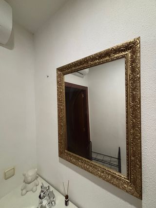 Elegante espejo con marco dorado, ideal para eventos especiales. - Diseño romántico con detalles grabados. - Marco de madera con acabado dorado. - Superficie de cristal.