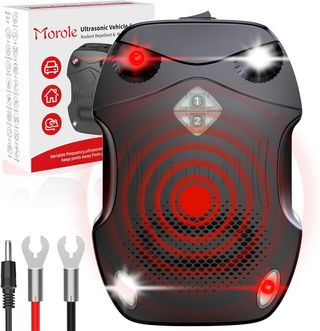 Dispositivo ultrasónico Morole para repeler roedores en vehículos e interiores. Diseñado para mantener alejados a los animales no deseados. - Tecnología ultrasónica y LED intermitente. - Incluye cables de conexión para vehículo y USB. - Manual de usuario incluido.
