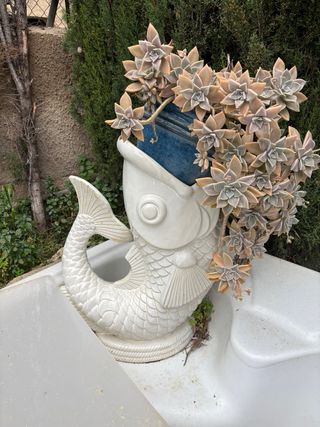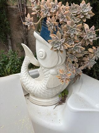 Original florero con forma de pez, ideal para dar un toque divertido a tu hogar. - Diseño único de pez. - Materiales de cerámica y plástico.