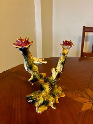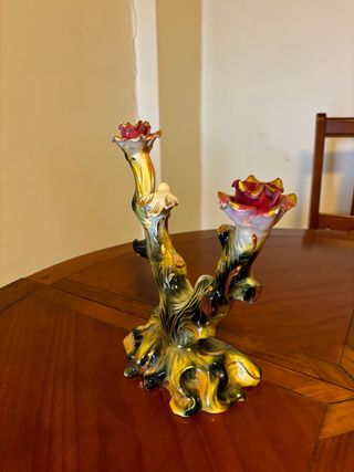 Figura decorativa vintage con un diseño floral único. - Base con acabado en tonos dorados y multicolor. - Detalle de flores en la parte superior.
