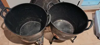 Set de paelleros de hierro fundido, incluye capasos y bases. - Material de hierro fundido. - Color negro y gris.(medidas en las fotos)((Paelleros 55cms, capasos 44cms)