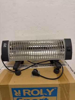 Calefactor HJM con base y ruedas. - Diseño moderno en color gris y negro. - Fabricado en metal y plástico. -se entreta en mano