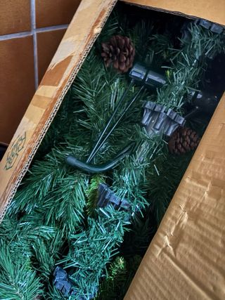 Árbol de Navidad artificial con un toque invernal. 210cm de altura - Ramas verdes con puntas nevadas. - Decorado con piñas. - Incluye luces cálidas pero no sé porque solo funciona la parte de abajo.