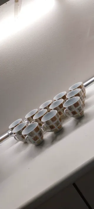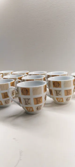 Conjunto de doce tazas de café con un diseño elegante. - Fabricadas en porcelana. - Tonos beige y marrón.