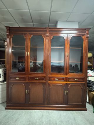 Elegante mueble de caoba hecho a mano, con puertas de cristal y detalles de madera. - Diseño clásico y atemporal. - Acabado en madera de caoba. - Puertas con tiradores envejecidos de metal