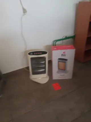 Calefactor portátil con un diseño moderno. - Color blanco con detalles en rojo. - Fabricado en plástico resistente.
