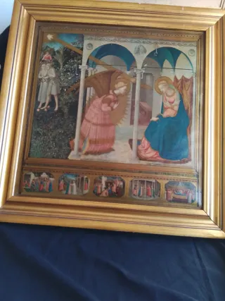 Reproducción del famoso cuadro La Anunciación, es una reproducción imprimida en tela, el marcó está policromado, mide 68x67cm, tiene un pequeño desperfecto que se ve en las fotos, fácil de arreglar - Marco de madera con acabado dorado. - Pintura multicolor.