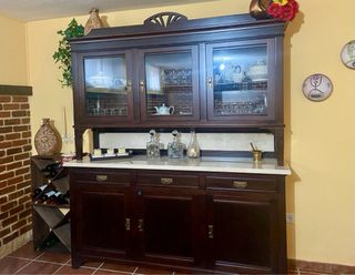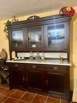 Elegante alacena con estructura de madera maciza y encimera de mármol. Sus puertas de cristal permiten ver el interior. - Diseño clásico y funcional. - Acabado en tonos marrones y beige.