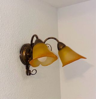 Elegante aplique de pared con un diseño clásico. - Acabado metálico en tono dorado. - Tulipanes de cristal en color amarillo. - Ideal para añadir un toque de luz y estilo a cualquier habitación. TENGO 2: cada una EUR10