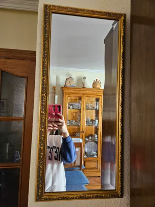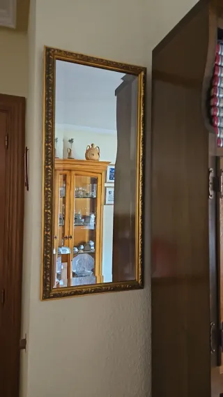 Elegante espejo con marco detallado en tonos dorados y marrones. Sus dimensiones lo hacen ideal para cualquier espacio. - Medidas: 73 cm de alto x 33 cm de ancho. - Marco con diseño ornamental.
