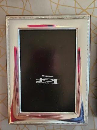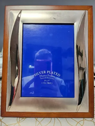 Elegante marco de fotos con un diseño moderno que combina detalles plateados y un acabado de madera. - Acabado plateado brillante. - Marco exterior de madera. - Tamaño para foto de 5 x 7 (13 x 18cm). - Resistente al deslustre. Tiene un pequeño rayon que se ve en la foto, de ahi su precio