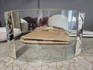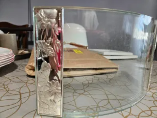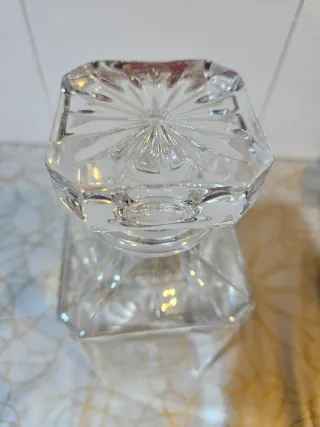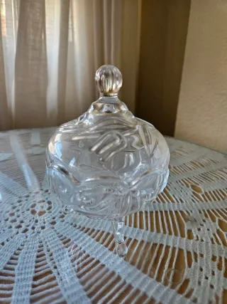 Elegante bombonera de cristal tallado con su tapa a juego. Ideal para dulces o pequeños objetos. - Diseño intrincado y detallado. - Pieza decorativa con un toque de sofisticación.