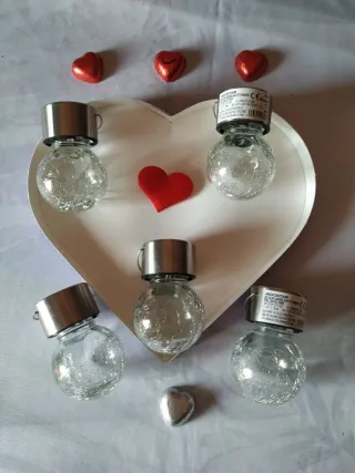 Conjunto de cinco luces solares decorativas para exteriores. Ideales para iluminar caminos o crear ambiente. - Diseño esférico con acabado craquelado. - Parte superior metálica plateada.