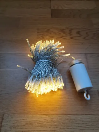 Guirnalda de luces LED de 20 metros con 200 puntos de luz. 8 tipos o modos de entenderse las luces. Funciona a pilas. Se puede poner en el exterior. Tira. Cadena de luces, Navidad. - Cable de color plateado. - Luces de color blanco cálido.