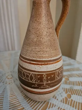 Precioso jarrón de cerámica con un diseño vintage danés. Su acabado combina tonos beige y marrón, con detalles decorativos grabados. - Diseño con bandas decorativas. - Motivos geométricos y figurativos. - Asa curva característica.