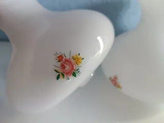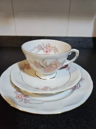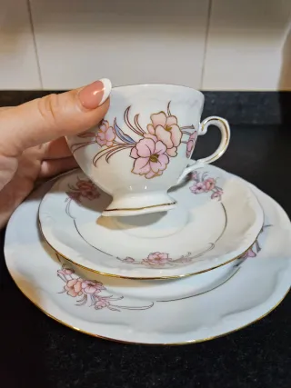 Conjunto de porcelana vintage con un delicado diseño floral. - Taza con plato. - Plato adicional. - Borde dorado.