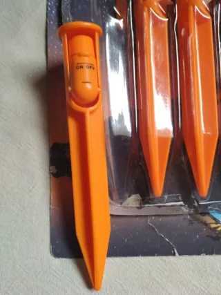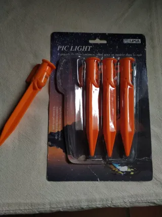 Pack de 4 piquetes luminosos PIC LIGHT. Son ideales para orientarse en la oscuridad. - Color naranja brillante. - Diseño cónico para fácil inserción. - Sin estrenar abierta una para que se vea. Échale un vistazo a mi perfil hay más cosas bonitas