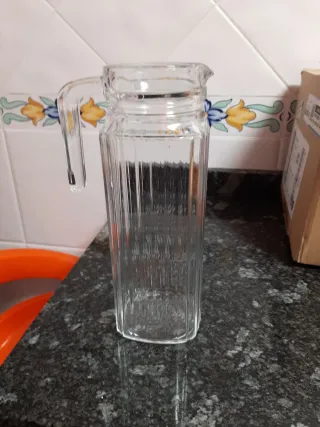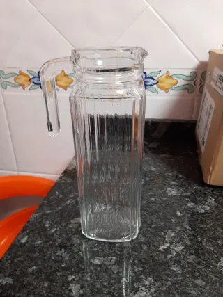 Jarra de cristal con un diseño alargado y elegante. - Asa lateral para un agarre cómodo. - Borde superior con un pequeño pico vertedor.