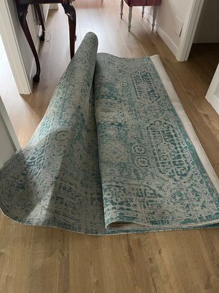 Preciosa alfombra de 2,60 x 2,06 cm., diseño clásico y elegante. Sus tonos turquesa le dan un toque moderno y vibrante. Costó 1.000 euros - Fabricada a máquina. - Diseño intrincado y detallado.