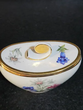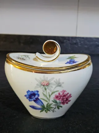 Elegante azucarero de porcelana con detalles dorados y un diseño floral pintado a mano. - Acabado con borde y asa en dorado. - Decorado con flores alpinas. - Pieza de porcelana de alta calidad.