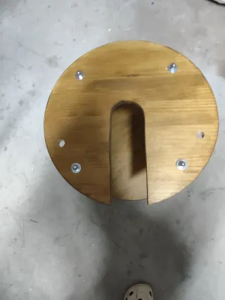 Mesa artesanal con un diseño único. - Base circular de madera. - Corte en forma de U. - Fijaciones metálicas. Se pueden hacer a otras medidas