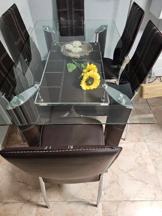 Conjunto de mesa de comedor con superficie de cristal y seis sillas tapizadas en piel. - Mesa de 180 cm de largo. - Sillas con estructura metálica. Precio algo negociable.