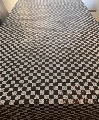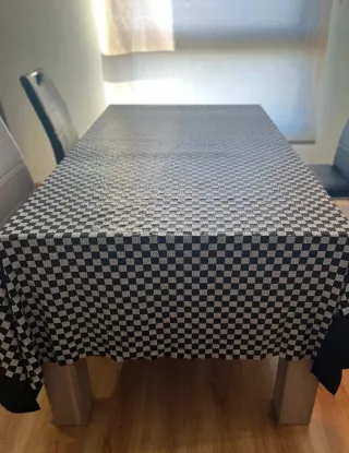 Elegante mantel con un diseño de cuadros en tonos negros y plateados. Añade un toque de distinción a tu mesa. - Diseño de cuadros. - Acabado brillante.