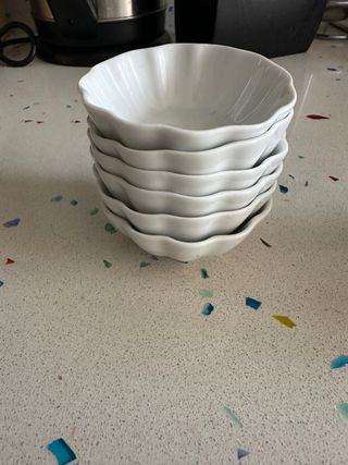 Se venden seis cuencos pequeños de cerámica blanca. Son ideales para aperitivos o postres. Tienen un diseño con ondas en el borde, dándoles un toque elegante y delicado. - Material: Cerámica - Color: Blanco - Cantidad: 6 - Diseño ondulado