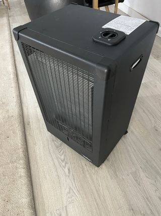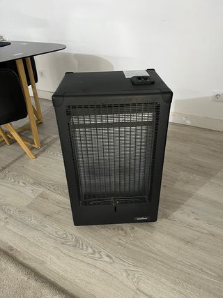 Estufa de gas en color negro, ideal para calentar espacios. - Fabricada con materiales resistentes. - Diseño moderno y funcional. - Fácil uso.