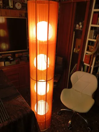 Elegante lámpara de pie con un diseño cilíndrico forrado con hilos y tres tulipas que aporta un toque moderno a cualquier espacio. Su estructura difumina la luz creando un ambiente acogedor. - interruptor de pie. - medidas en las fotos - Altura considerable para iluminar estancias amplias. - Base estable para mayor seguridad. Recogida en Villarreal. NO SE ENVÍA.