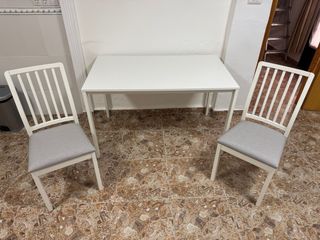 Mesas y sillas que compramos hace 2-3 meses, no las hemos usado, están nuevas como se puede ver. 35€ por todo, PRECIO NO NEGOCIABLE, 35€ es más que justo por todo. Medidas de la mesa: 125cm de ancho, 75cm de alto y 75cm de fondo. Medidas de las sillas: 95cm de alto y 38cm de ancho. Se regalan 4 protectores de las sillas con el precio.